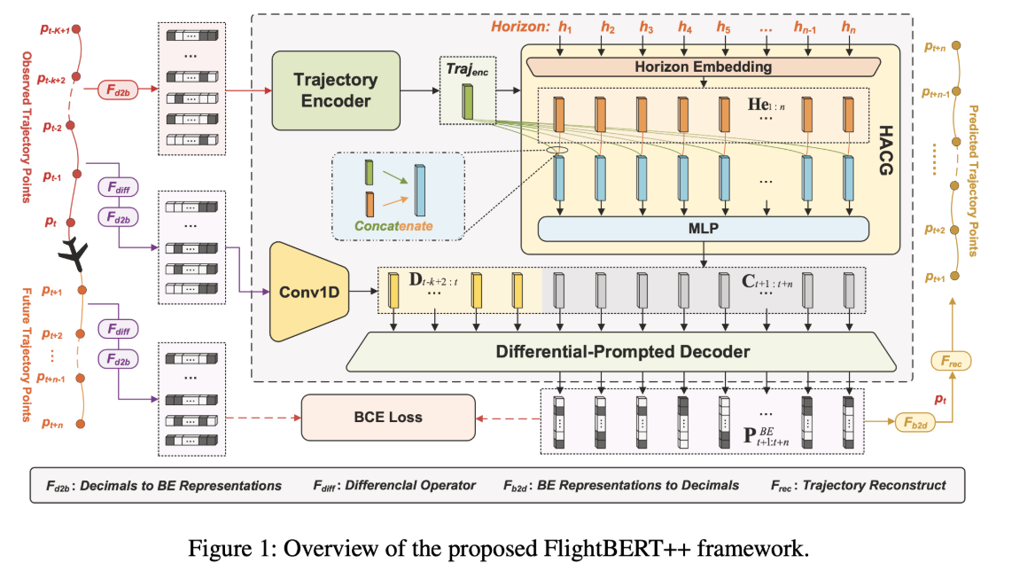 输入: - Observed Trajectory Points (Pt-k+1, …, Pt): 表示观测到的历史飞行轨迹点序列。下标 t-k+1 表示序列的起始时间点, t 表示当前时间点。 - Future Trajectory Points (Pt+1, …, Pt+n): 表示需要预测的未来飞行轨迹点序列。注意,在训练阶段会使用真实的未来轨迹点,用于计算损失并优化模型,而在预测阶段,这些点是未知的,需要模型来预测。 - Fd2b: Decimals to BE Representations: 表示十进制转换为二进制编码,将经纬度等信息转换为BE。