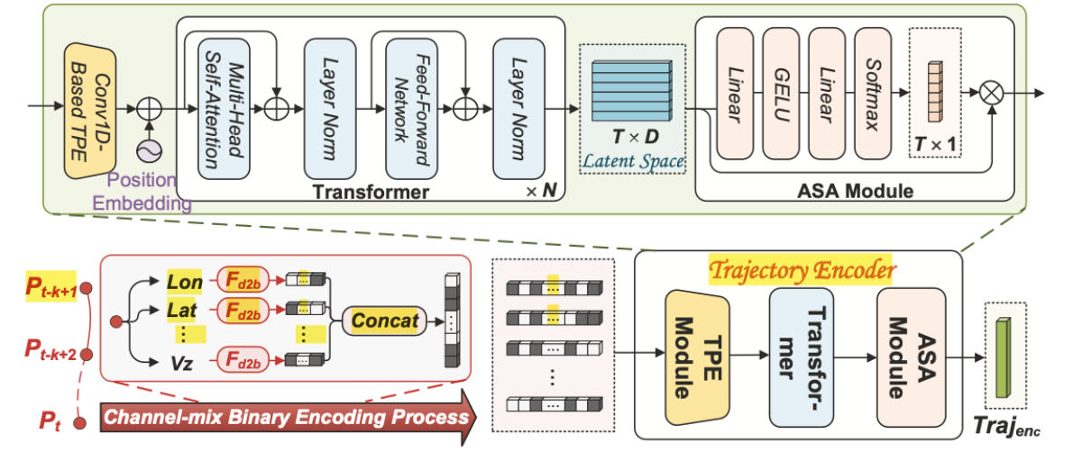 \[Z = \text{Transformer}(E_{t-k+1}, …, E_t)\]将 Transformer 输出的所有时间步表示做加权求和,形成一个轨迹级别的表示: