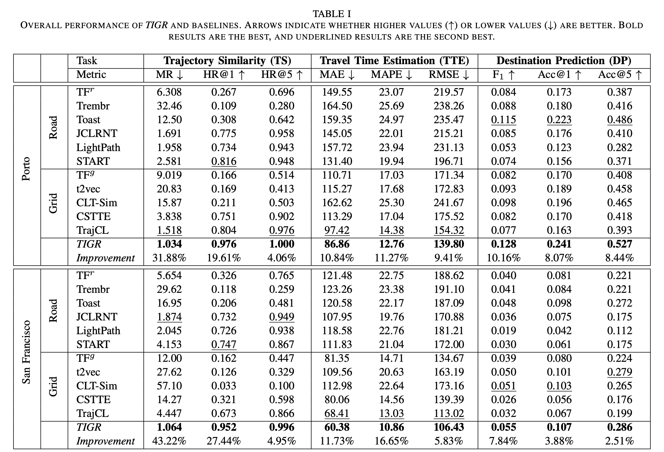 行驶时间估计 (TTE - Travel Time Estimation): 预测轨迹的总行驶时间。在学习到的表示上训练一个 MLP 预测器(只使用开始时间以避免信息泄露)。指标:平均绝对误差 (MAE↓),平均绝对百分比误差 (MAPE↓),均方根误差 (RMSE↓)。