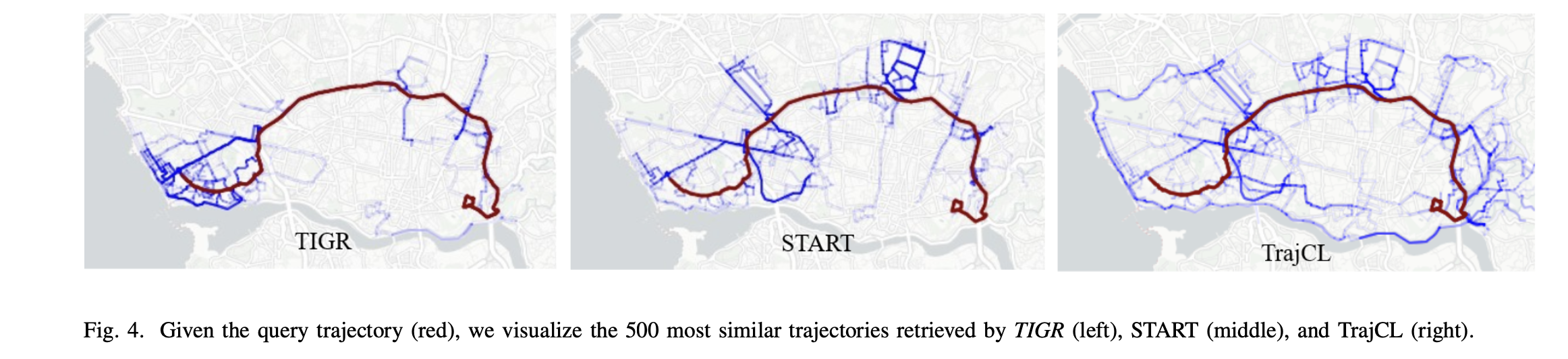 轨迹相似度 (TS - Trajectory Similarity): 给定一个查询轨迹,在数据库中找到最相似的轨迹。设置:将轨迹拆分为奇数点(查询)和偶数点(数据库项),并加入大量负样本 (k_neg) 增加难度。指标:平均排名 (MR↓),命中率@1/5 (HR@1/5↑)。