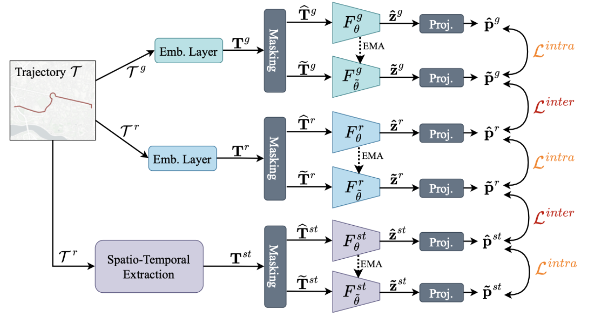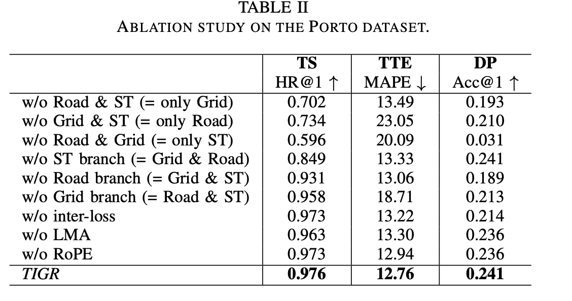 \[\mathcal{L}_{TIGR}=\lambda\mathcal{L}^{intra}+(1-\lambda)\mathcal{L}^{inter}.\]- 时空分支(spatio-temporal branch,st)基于道路网络交通信息,因此与网格模态(grid modality,g)截然不同。 经验性地对齐这两个分支会降低所学习的轨迹表征的质量。