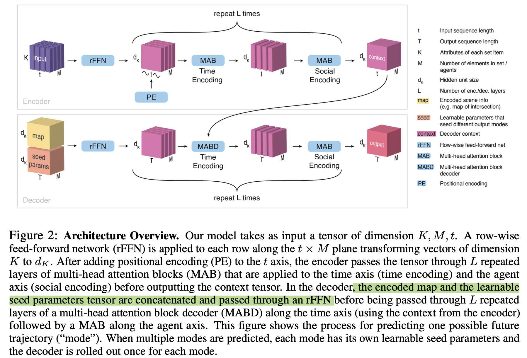 - Temporal + Social MHSA 操作交替叠加 $L_{enc}$ 层,输出上下文张量: