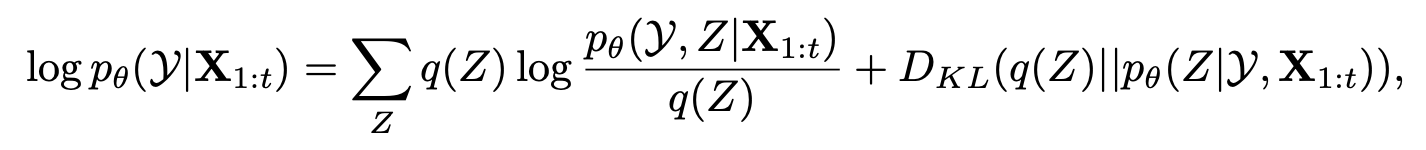 $\log p_\theta(Y \mid X_{1:t}) = \sum_Z p(Z \mid Y, X_{1:t}) \log p_\theta(Y, Z \mid X_{1:t})$