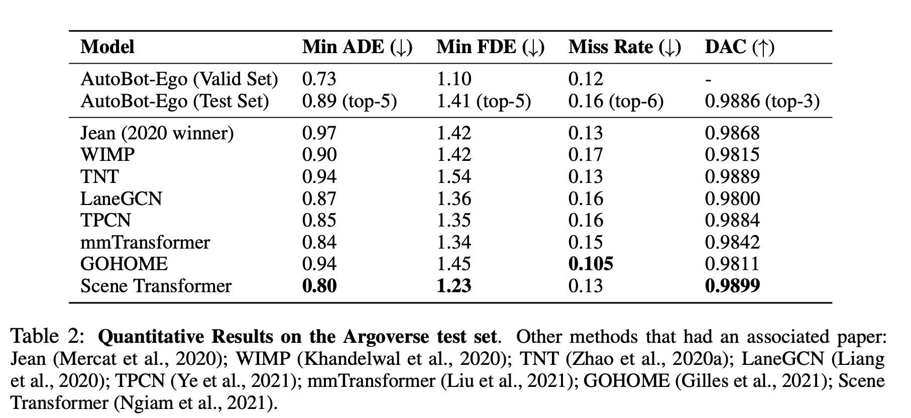 对比 2020 年冠军 Jean 模型,AutoBot-Ego 在 Min ADE 等指标上接近或优于其表现。